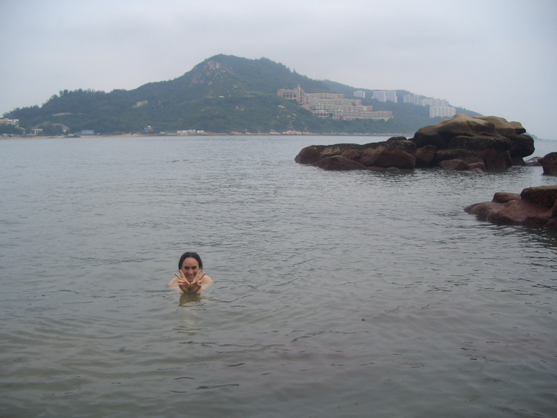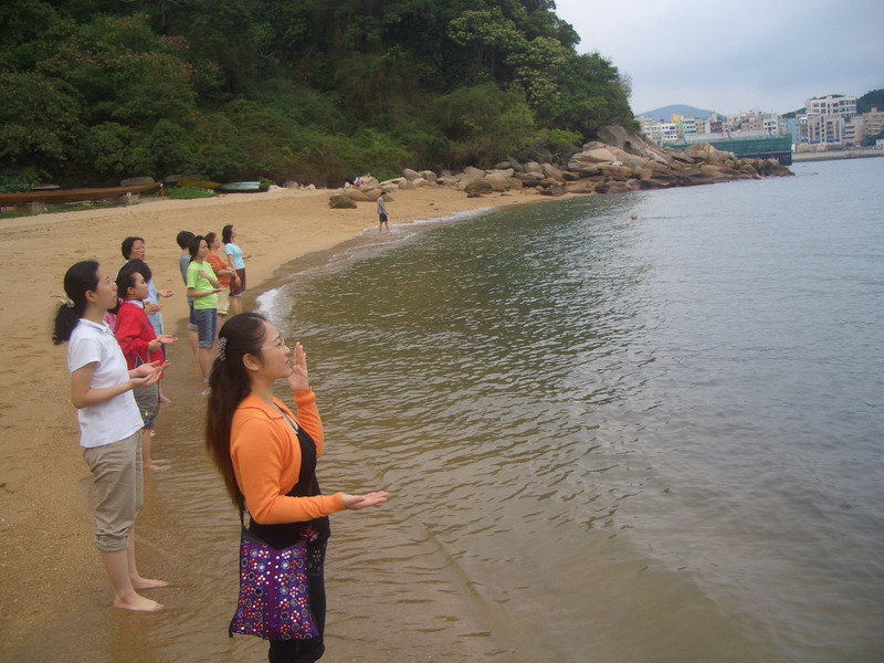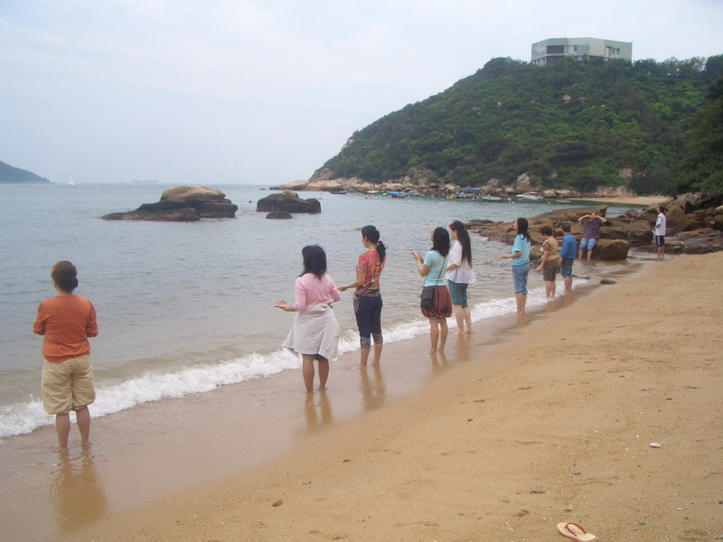 巴士绕着海边回旋的山路快速行进,雨,小了很多,在车窗上可以看到落在上面的雨滴。从车上往下方眺望大海,实在是令人心旷神怡,海水碧蓝,偶尔有船只飘过,并没打破画面的宁静,连绵的树木茂盛而翠绿,山路弯度很大,车速却很快,大约四十分钟后我们到了赤柱,这时雨已停了,感谢上天,我们能如愿进行户外练习了。