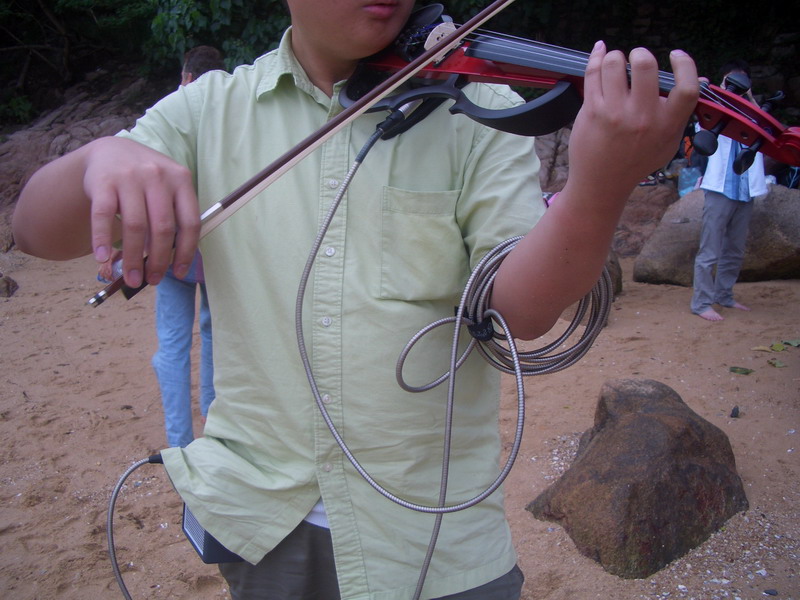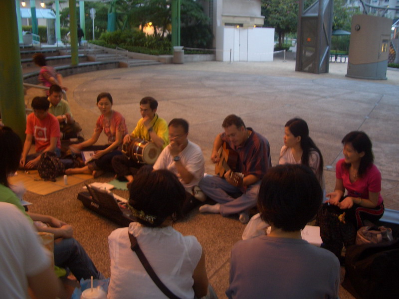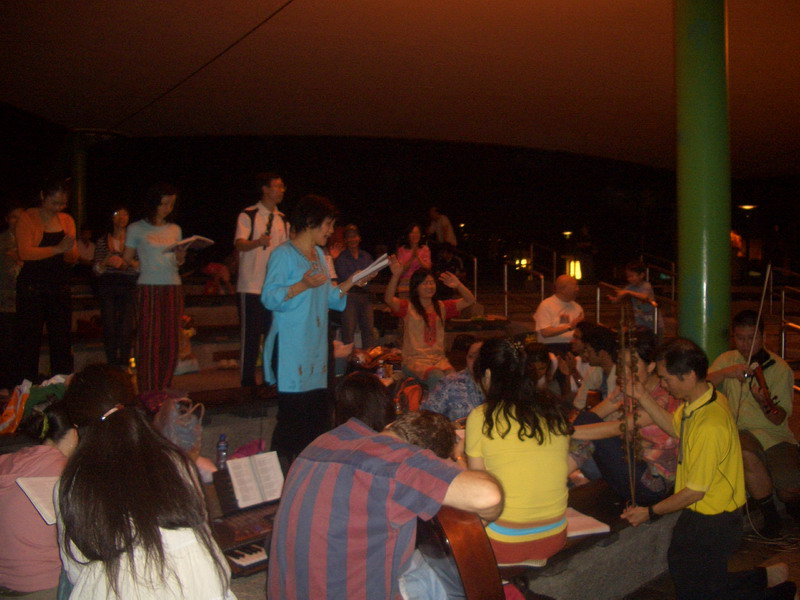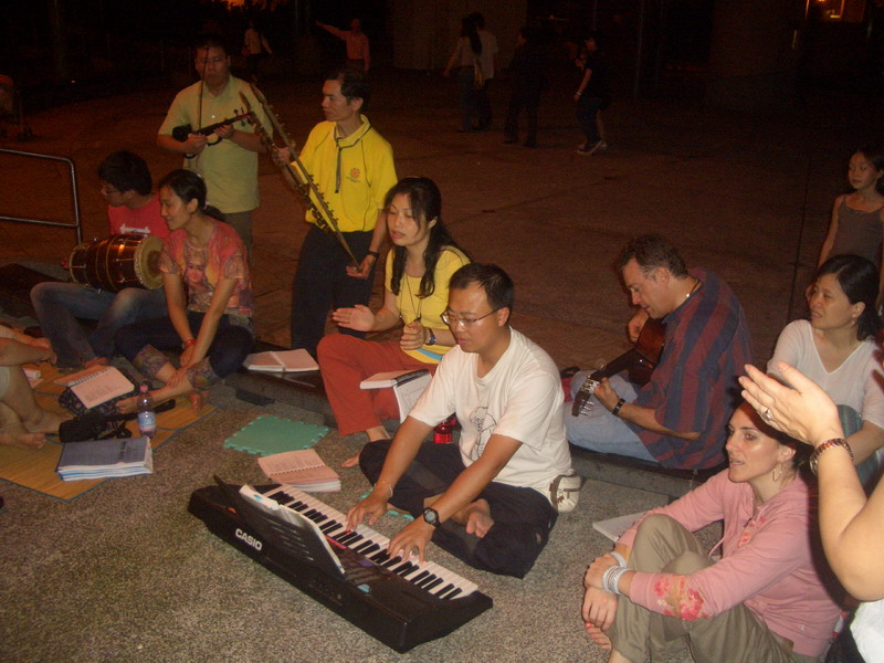 火祭结束后,大部队来到露天广场闲情坊。只见十来条弧形石橙围着中心表演区,后边是酒家餐厅,陆续有人从广场中走过,我们在一排排石櫈上坐下,前面是乐队,侯生摇铃、何大哥弹电子琴,马来西亚的若清拉小提琴,Saraswati打鼓,