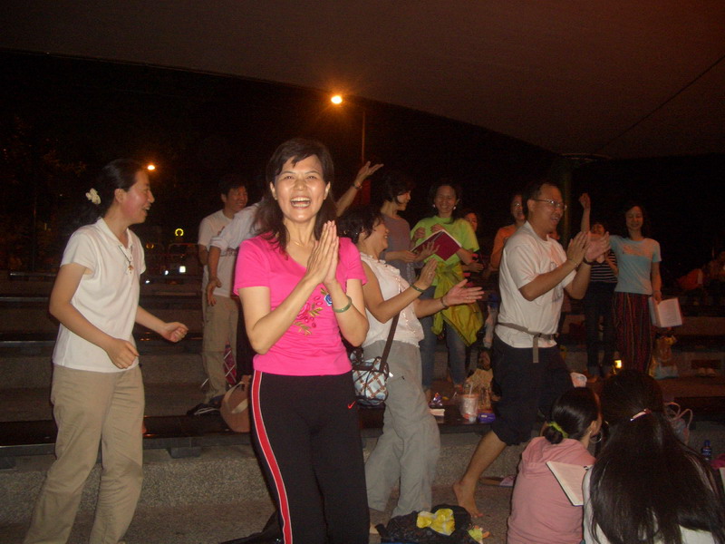 有人被歌声吸引过来了,You或侯太便向他们作介绍,派发宣传单张。来的不但有中国人还有西方人、印度人。一个金发碧眼的男子推着婴儿车,里面有个八九个月大的幼儿,眼睁得大大的,入迷地看着大家演奏乐器,You和推车的男子谈了起来,男子点头微笑,原来他们已得到自觉了!不知谁带来一只小狗,趴在队伍中,看着大家奏乐演唱,不断地摇着尾巴伸长舌头,随着旋律轻轻点头,它也在享受呢!有三四个年青的印度人也被吸引过来,他们本来就生长在充满灵性的国度,现在听着用他们母语唱的拜赞歌,极为开心,兴高采烈地坐到我们中间也跟着唱,听介绍的时候,不断地点头,他们都拿了简介,看来他们一定会去详细了解。其中一个小伙子还走进乐队,接过鼓跟着打起来。快结束的时候,Annti带着我们十几个人到广场中间跳起了舞,印度小伙子也随着我们一起跳,唱的唱跳的跳,整个广场成了一片喜乐的海洋。最后全体起立,高唱“遍传千万里”,祝愿母亲的爱撒遍全世界每个角落,走进每个人心中。