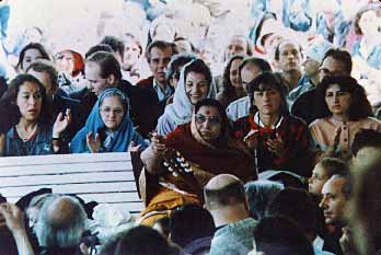 1989年錫呂.瑪塔吉女士在意大利時與一群霎哈嘉瑜伽練習者在船上的情景。當時他們是為了慶祝五月五日頂輪紀念日而正在前往卡普里島。前面一班練習者在唱拜讚歌。