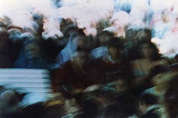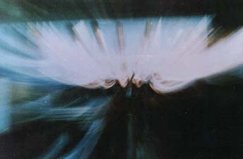These photographs were taken on a boat, while Sahaja Yogis were singing around Shri Mataji. You can see the progression of the vibrations showing, from the first picture which is absolutely normal, to the last one where the vibrations of all Sahaja Yogis seem to merge above Shri Mataji's head. The only thing that is still distinguishable in all frames is the vague shape of the bench at the left of the image.