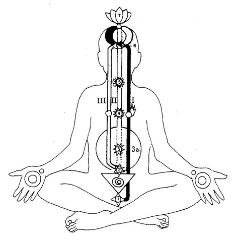 (3) 那束微妙的能量經頭蓋骨最高處的梵穴(Brahmarandra)進入一個人的身體,經由中脈(Sushumna),途中穿過六個能量中心(Chakras),最後停留在一個叫Mooladhara的三角骨,意即根的支持力的部位,捲曲成三圈半的形狀。這個位於脊柱中脈的微妙能量在粗淺層面〔物質界〕表現為副交感神經系統。各個能量中心(Chakra)位於脊柱骨及大腦之內。能量中心表現為身體中各部分的神經叢 (plexus),同時作用於身體左部,影響著我們的情緒。西方醫學對身體左部的系統所知甚少。心理學是對應左脈的學科,但所得的知識亦甚為有限。